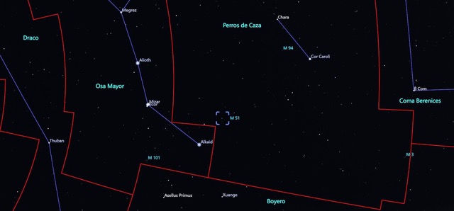 La galaxia M51 estará bien ubicada para su observación la mayor parte de la noche, en dirección de la constelación de los Perros de Caza y con una magnitud aparente de 8.1, es visible con binoculares o telescopios pequeños hacia la parte noreste de la esfera celeste.