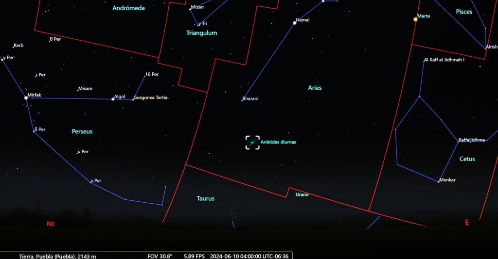 Entre otros objetos y eventos relacionados con esta constelación, tenemos las Ariétidas Diurnas, caracterizadas por tener sus mejores momentos durante el día. Esta lluvia de meteoros tiene actividad del 14 de abril al 24 de junio, con un máximo el 10 de junio. La tasa máxima observable será de 50 meteoros por hora, en dirección, desde luego, de la constelación de Aries. El cuerpo principal responsable de la lluvia ha sido identificado como el cometa 96P/Machholz. El mejor momento será al amanecer del día 10, pero estará muy cerca del horizonte, hacia la parte noreste de la esfera celeste.