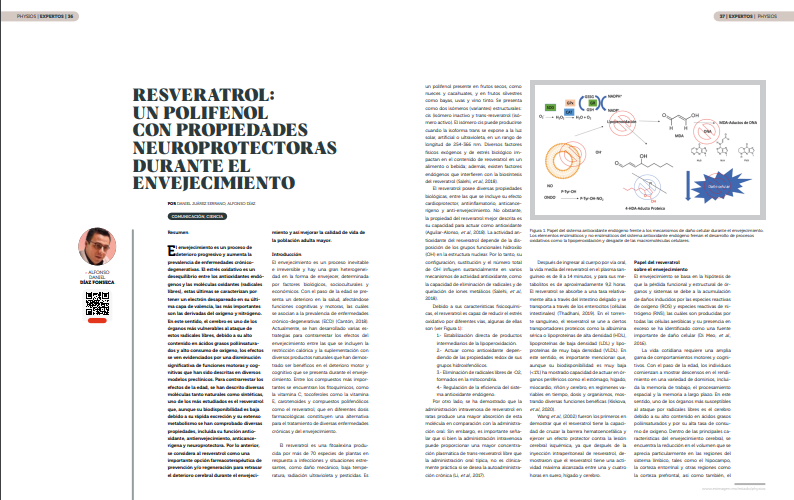 El envejecimiento es un proceso de deterioro progresivo y aumenta la prevalencia de enfermedades crónico-degenerativas. El estrés oxidativo es un desequilibrio entre los antioxidantes endógenos y las moléculas oxidantes (radicales libres), estas últimas se caracterizan por tener un electrón desapareado en su última capa de valencia, las más importantes son las derivadas del oxígeno y nitrógeno. En este sentido, el cerebro es uno de los órganos más vulnerables al ataque de estos radicales libres, debido a su alto contenido en ácidos grasos poliinsaturados y alto consumo de oxígeno, los efectos se ven evidenciados por una disminución significativa de funciones motoras y cognitivas que han sido descritas en diversos modelos preclínicos. Para contrarrestar los efectos de la edad, se han descrito diversas moléculas tanto naturales como sintéticas, uno de los más estudiados es el resveratrol que, aunque su biodisponibilidad es baja debido a su rápida excreción y su extenso metabolismo se han comprobado diversas propiedades, incluida su función antioxidante, antienvejecimiento, anticancerígena y neuroprotectora. Por lo anterior, se considera al resveratrol como una importante opción farmacoterapéutica de prevención y/o regeneración para retrasar el deterioro cerebral durante el envejecimiento y así mejorar la calidad de vida de la población adulta mayor.