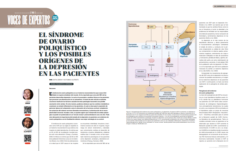 El síndrome de ovario poliquístico es un trastorno neuroendocrino que causa infertilidad en mujeres alrededor del mundo. Se ha reportado que cerca del 38% de las pacientes desarrollan depresión, la cual se ha asociado a cambios físicos en las pacientes que provocan una disminución en su autoestima. A través de este artículo se plantea una breve reseña de los factores causales de estas patologías buscando una posible asociación entre ambas. De esta manera, podemos destacar que los cambios metabólicos ocasionan un estado inflamatorio en las pacientes, el cual es clave para la expresión de patrones típicos de la depresión como la elevación de la hormona cortisol, la depleción de sustancias del sistema nervioso llamadas monoaminas y la disminución de la neuroplasticidad neuronal. Aunado a esto, se puede sugerir que el desarrollo de ambas patologías se puede ver potenciado en un “círculo vicioso” promoviéndose la una a la otra. Todo esto demuestra la importancia del estudio de la depresión en pacientes con síndrome de ovario poliquístico con la finalidad de obtener una mejor estrategia en su control.