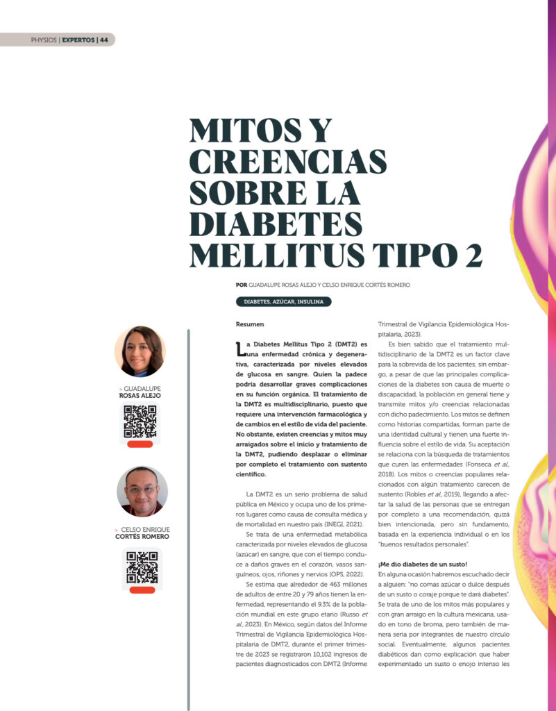 La Diabetes Mellitus Tipo 2 (DMT2) es una enfermedad crónica y degenerativa, caracterizada por niveles elevados de glucosa en sangre. Quien la padece podría desarrollar graves complicaciones en su función orgánica. El tratamiento de la DMT2 es multidisciplinario, puesto que requiere una intervención farmacológica y de cambios en el estilo de vida del paciente. No obstante, existen creencias y mitos muy arraigados sobre el inicio y tratamiento de la DMT2, pudiendo desplazar o eliminar por completo el tratamiento con sustento científico.