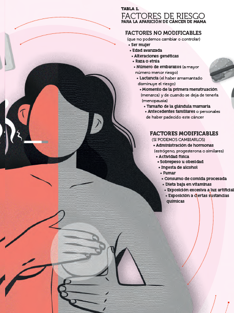 El cáncer de mama es el principal tipo de cáncer que se diagnostica en la mujer a nivel mundial con más de 2 millones de nuevos casos en el año 2020. Su aparición y número de muertes se han incrementado de manera significativa en las últimas tres décadas, esto se debe, al menos en parte, a la existencia de mejores métodos para el diagnóstico. Los factores de riesgo también se han ido evidenciando en este periodo de tiempo, lo que ha permitido clasificarlos en aquellos que podemos cambiar y los que no (esto es, modificables y no modificables, respectivamente). El conocimiento de estos factores por parte de la población, es un elemento clave para poder disminuir su aparición o bien, detectarlo a tiempo. Los tratamientos que actualmente se aplican depende del tipo y extensión del cáncer al momento de diagnosticarlo, algunos de estos pueden ser empleando cirugía, es decir, quirúrgicos o bien no quirúrgicos, como lo es la quimioterapia.