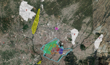 Las zonas en las que se instalaron las fábricas textiles en el periodo de estudio fueron tres; sin embargo, hay dos zonas que son anteriores pero que siguieron funcionando hasta 1938, como lo veremos más adelante. Se puede apreciar la mancha urbana con dos centralidades: el Centro Histórico de la ciudad de Puebla y Cholula; es decir, dos puntos de referencia histórica situadas en el área Metropolitana de Puebla. La zona marcada en color naranja corresponde a la ciudad virreinal hasta 1892 y en azul los límites de la ciudad hasta 1938. El territorio ocupado entre la línea naranja y la azul corresponde entonces al periodo de estudio de este trabajo. En la misma, se identifican en blanco las áreas industriales contemporáneas: a la izquierda está el polígono industrial de FINSA, donde se encuentra la Planta de VW, al centro el de Puebla 2000 y a la derecha el de Amozoc. Entre el primero y el segundo se localiza la Central de Abasto, marcada de color violeta. Esta imagen nos permite comprender el desarrollo el proceso de industrialización histórico y contemporáneo.