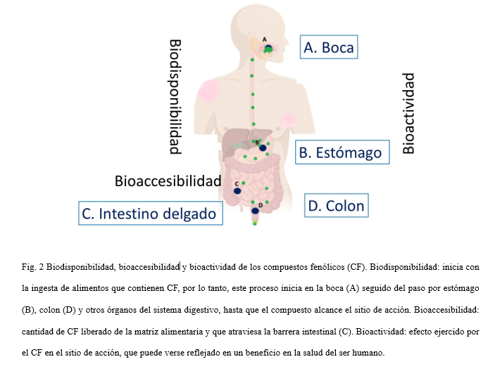 Por otro lado, la digestión de los CF juega un papel importante en su biotransformación y biodisponibilidad. En este caso, existen varios factores que afectan la biodisponibilidad de los CF consumidos en los alimentos. Pero antes de explicarlos, es preciso definir los siguientes conceptos: a) biodisponibilidad se define como la fracción de un nutriente o compuesto ingerido que llega al sistema digestivo, circulación sanguínea y a los sitios específicos donde ejerce su acción biológica; b) bioaccesibilidad, es la cantidad de cualquier componente alimentario que es detectable en el intestino una vez liberado de la matriz alimentaria y que puede atravesar la barrera intestinal para ser bioactivo; c) bioactividad es el cambio en el estado de salud del ser humano mediado por los constituyentes de los alimentos, la cual depende de la absorción adecuada, la vía de administración, la forma de dosificación y la fisiología de cada individuo (Figura 2). Por lo tanto, la bioactividad adecuada de los CF está en función de la cantidad, dosis y exposición de estos compuestos en la zona de absorción. También depende de que en el intestino la actividad enzimática, el tiempo del tránsito, la microflora y otras condiciones fisiológicas funcionen adecuadamente. Esto ocurre por la solubilización directa (37° C, pH 1-7.5) o por la acción de las enzimas digestivas que hidrolizan los enlaces no covalentes entre los grupos -OH de los CF y los grupos polares de los polisacáridos (Palafox et al., 2011). No obstante, dependiendo de su tamaño y grado de conjugación, sólo una parte de los CF son capaces de atravesar la pared intestinal (Saura-Calixto, 2010).