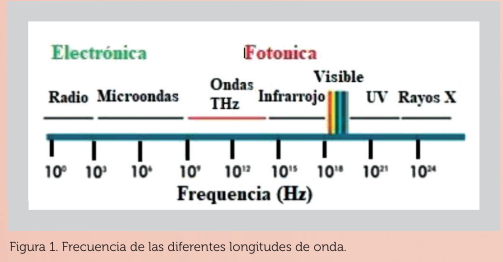 Esto significa, que luz de color rojo oscila a ¡384 billones de veces por segundo! Valor bastante elevado si consideramos que el voltaje alterno con el cual encendemos las lámparas de la casa es de tan solo 60 veces por segundo. Gracias a las características de frecuencia y velocidad de la luz, es que han surgido sistemas de comunicaciones que operan en frecuencias en el rango de los Terahertz (THz, billones de veces por segundo) que, evidentemente superan a los sistemas de comunicaciones como son la radio en AM (amplitud modulada) y FM (frecuencia modulada) que operan en el rango de los Kilohertz (KHz, miles de veces por segundo) y Megahertz (MHz, millones de veces por segundo), respectivamente. Incluso, supera los sistemas de telefonía celular los cuales operan en el rango de las microondas (Gigahertz, miles de millones de veces por segundo). (Ver Figura 1).
