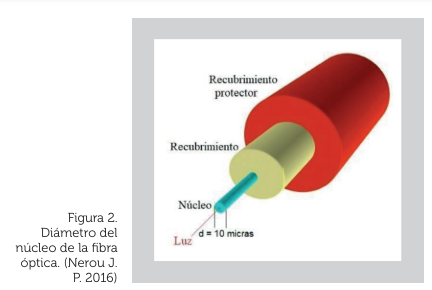 Así como los sistemas clásicos de comunicaciones electrónicos utilizan cables metálicos para la distribución de la información en forma de corriente eléctrica, los sistemas que utilizan la luz (llamados sistemas fotónicos) requieren de un medio de distribución como lo es la fibra óptica. Es decir, la información que viaja a través de la fibra óptica, si bien no alcanza la velocidad de 300’000,000 de metros por segundo debido a las características de la fibra óptica, ésta se verá reducida a la nada despreciable velocidad de 200’000,000 de metros por segundo. Básicamente, una fibra óptica está formada por un núcleo (región donde viaja la luz), y al menos dos recubrimientos (Nérou J. P. 2016). El diámetro del núcleo es de 10 micras (1 micra es la millonésima parte del metro), para darnos una idea de esta dimensión, el diámetro del cabello humano es del orden de 50 micras. (Ver Figura 2).