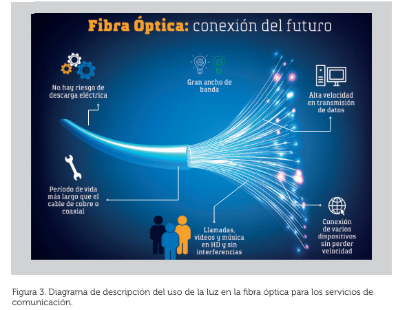 Actualmente, el concepto de fibra óptica se ha vuelto muy común en nuestro vocabulario y lo relacionamos generalmente a las compañías que ofrecen los servicios de alta velocidad y alta definición como son el Internet y la Televisión Digital de Alta Definición (Internetencasa). Ejemplo de esto, es la frase publicitaria “Navega a exceso de velocidad” usada por una compañía de telefonía en nuestro país que aprovecha la utilización de la luz en la fibra óptica para la entrega de sus servicios. (Ver Figura 3).