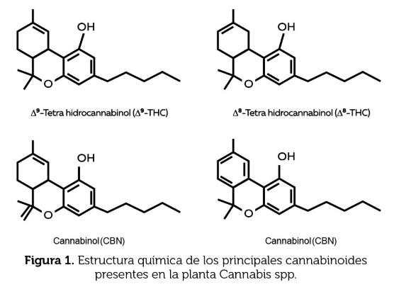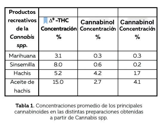 La planta de la cual proviene la marihuana pertenece al reino Plantae, división Magnoliophyta, clase Magnoliopsida, orden Rosales, familia Cannabaceae, género Cannabis. Está ampliamente distribuida por las regiones templadas y tropicales del planeta y se encuentra formada por más de cuatrocientos compuestos químicos, sin embargo, varían en número y en cantidad en función del clima, tipo de suelo, variedad cultivada e incluso de la forma en que se haya realizado su cultivo (Ramos Atance y Fernández Ruiz, 2000). Estas variaciones también dependen de la parte de la planta utilizada para su extracción, del modo de preparación de la droga para su consumo, así como de las condiciones en que se haya producido su almacenamiento. Aproximadamente, sesenta de los compuestos, presentan características estructurales comunes y han sido identificados como cannabinoides (Waller, 1971) que son los responsables de ocasionar los efectos psicoactivos característicos de la planta (Mendelson, 1987), entre los cannabinoides más conocidos se encuentran el Δ 9 -tetrahidrocannabinol (Δ 9 -THC), Δ 8 -tetrahidrocannabinol (Δ 8 -THC), cannabidiol (CBD), cannabicromeno (CBC), canabinol (CBN), cannabiciclol (CBL), cannabigerol (CBG) y el monometileter del canabigerol (CBGM), canabielsoina (CBE), canabitriol (CBT), dehidrocanabifurano, canabicitrano, canabiripsol que aparecen en cantidades diferentes según la variedad de Cannabis valorada (Turner y cols., 1980). De estos, el principal componente psicoactivo de la marihuana es el Δ 9 -THC el cual se concentra principalmente en la resina que se segrega en forma de gotas pegajosas a partir de las glándulas de las bracteas de la planta hembra. Esta resina actúa como un barniz natural que tiene la función de proteger a las hojas y flores de la desecación en los lugares cálidos que es donde la mayoría de estas crecen (Iversen, 2008) en la siguiente tabla se presentan los principales cannabinoides obtenidos de diferentes preparaciones.