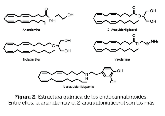 Con el descubrimiento de estos receptores, surgió una nueva idea, si existen receptores en el organismo en los que los canabinoides se unen y ejercen un efecto, entonces deben existir sustancias naturales que se unen a los receptores a canabinoides y desencadenar el mismo efecto, pero de manera natural. Para responder a esto, Devane y cols., en 1992 aislaron de un extracto de cerebro de cerdo, un compuesto lipídico derivado del ácido araquidónico y que puede unirse a los receptores a canabinoides CB 1 ,a esta sustancia se le denominó n-araquidoniletanolamina o anandamida (AEA), el cual se convirtió en el primer endocanabinoide aislado. Posteriormente se aisló al 2- araquidonilglicerol (2-AG) a partir de un intestino de perro (Mechoulam y cols., 1995), este compuesto lipídico puede unirse al otro receptor del sistema endocanabinoide, el CB 2 , así se descubrieron los dos compuestos que juegan el mismo papel de la marihuana pero de manera endógena.