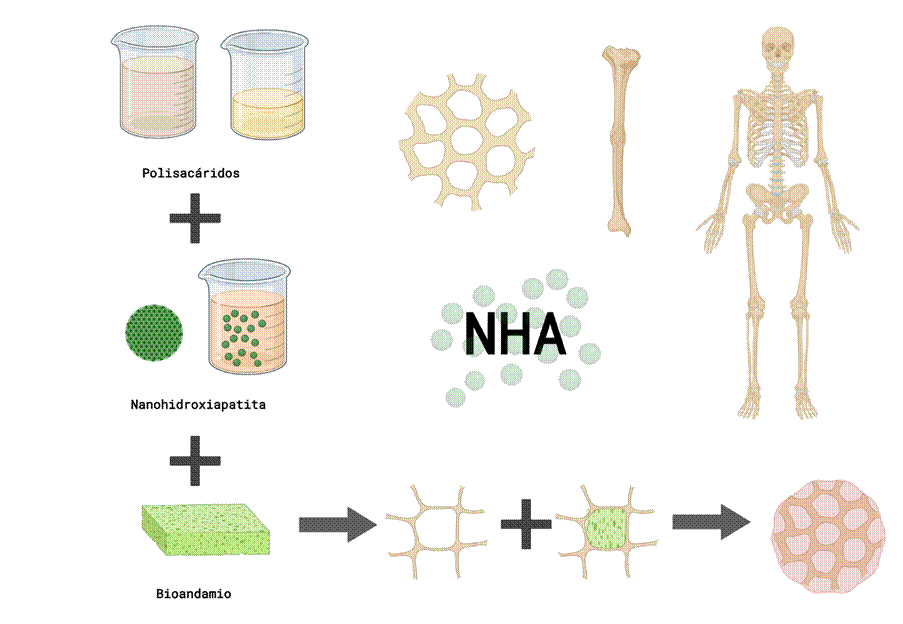 Entre los diferentes biomateriales que existen para la creación de andamios enfocados en la regeneración ósea están los materiales biocerámicos como lo son la HA, la NHA, el quitosano, el colágeno, etc. Estos componentes han tenido gran relevancia ya que presentan semejanza química con los componentes inorgánicos de hueso y de dientes.